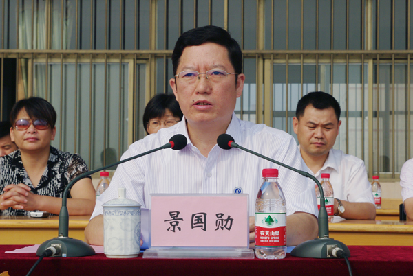 在激昂的《中国人民解放军进行曲》声中,2010级新生军训动员大会正式开始。首先,副校长景国勋代表学校向前来我校指导军训的71426部队全体官兵表示热烈的欢迎并致以崇高的敬意,向参加军事训练的全体新同学致以亲切的问候,之后他对71426部队的光荣传统作了简要介绍,并向同学们提出了五点希望和要求:一是要充分认识军训重要意义,主动自觉参加军训,发扬我校“好学力行”校风和“勤勉求是”学风,展现新世纪大学生的精神风貌。二是要尊重教官,虚心学习,提升自己的专业水平和思想道德修养,培养胸怀祖国、服务人民的崇高理想。三是要严格要求,刻苦努力,在军训中磨练自己的意志和精神品质。四是要严守纪律,听从指挥,为大学期间的有序生活和今后投身于祖国建设打下坚实的基础。五是要严格训练,确保安全,严防训练中发生各类意外事故。