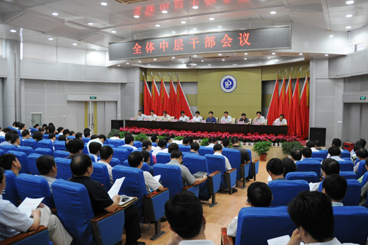 6月9日下午,学校在力行楼学术报告厅召开全体中层干部会议,宣布新一届处级领导班子、领导干部任免决定。校党政领导王少安、邹友峰、张国臣、周英、张战营、王裕清、张锟、景国勋、杨建堂,校长助理丁安民出席会议,全体中层干部参加会议。会议由校长邹友峰主持。