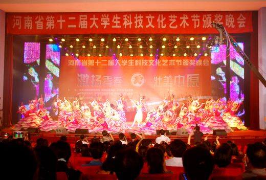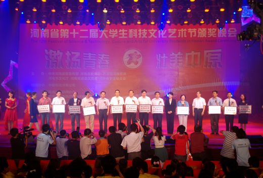 6月12日晚,由中共河南省委宣传部、河南省教育厅、共青团河南省委、河南省文化厅、河南省通讯管理局、河南省学生联合会共同主办的“河南省第十二届大学生科技文化艺术节颁奖晚会”在郑州隆重举行。由于组织得力,我校在本届大学生科技文化艺术节上收获颇丰,成绩显著:我校获得“河南省第十二届大学生科技文化艺术节优秀组织奖”荣誉称号。省委常委、宣传部部长、副省长孔玉芳,省教育厅厅长蒋笃运,共青团河南省委书记何雄,以及省文化厅、省通信管理局的领导出席颁奖晚会并颁奖。我校校团委副书记陈昊参加了此次颁奖晚会,音乐学院的学生代表参与了颁奖晚会的汇报演出。