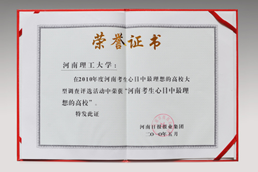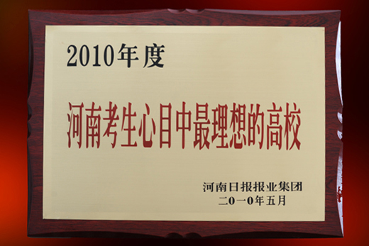 5月11日,河南教育发展高峰论坛暨“2010年度河南考生心目中最理想的高(学)校”颁奖典礼举行,我校荣获“河南考生心目中最理想的高校”殊荣。