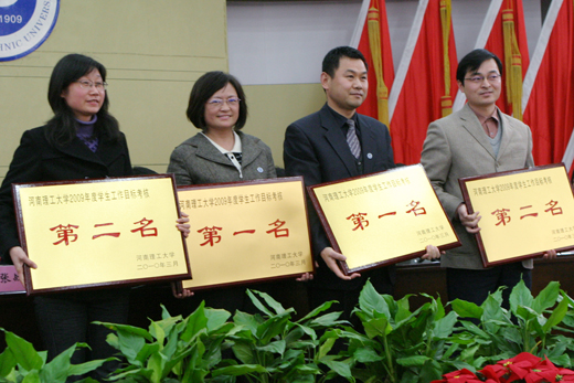 大会在嘹亮雄壮的国歌中拉开帷幕。首先,副校长张战营宣读了获得2009年度院(系)学生工作目标考核单项奖的院(系)名单和《关于表彰2009年度优秀辅导员、优秀班主任的决定》。接着,在欢快的乐曲声中,在主席台就坐的领导为2009年度学生工作目标考核先进院(系)和优秀辅导员、优秀班主任代表进行了颁奖。电气学院许增巍老师和能源学院倪小明老师分别代表优秀辅导员和优秀班主任进行发言。然后,就业中心主任曹俊伟和学生工作部(处)部(处)长邵强分别向大会总结汇报了我校2009年就业工作和学生工作,并分别就本年度的有关工作进行了安排部署。