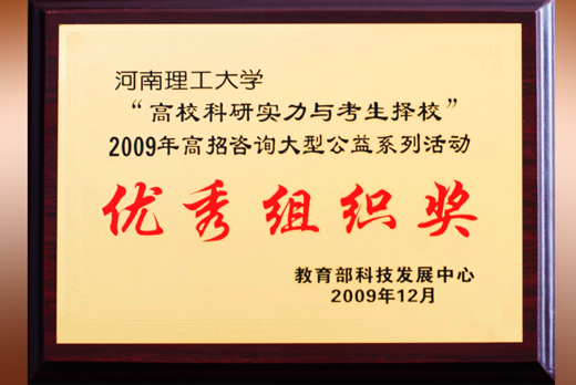 近日,我校荣获教育部科技发展中心授予的“高校科研实力与考生择校” 2009年高招咨询大型公益系列活动优秀组织奖,这是我校连续三年获此殊荣。