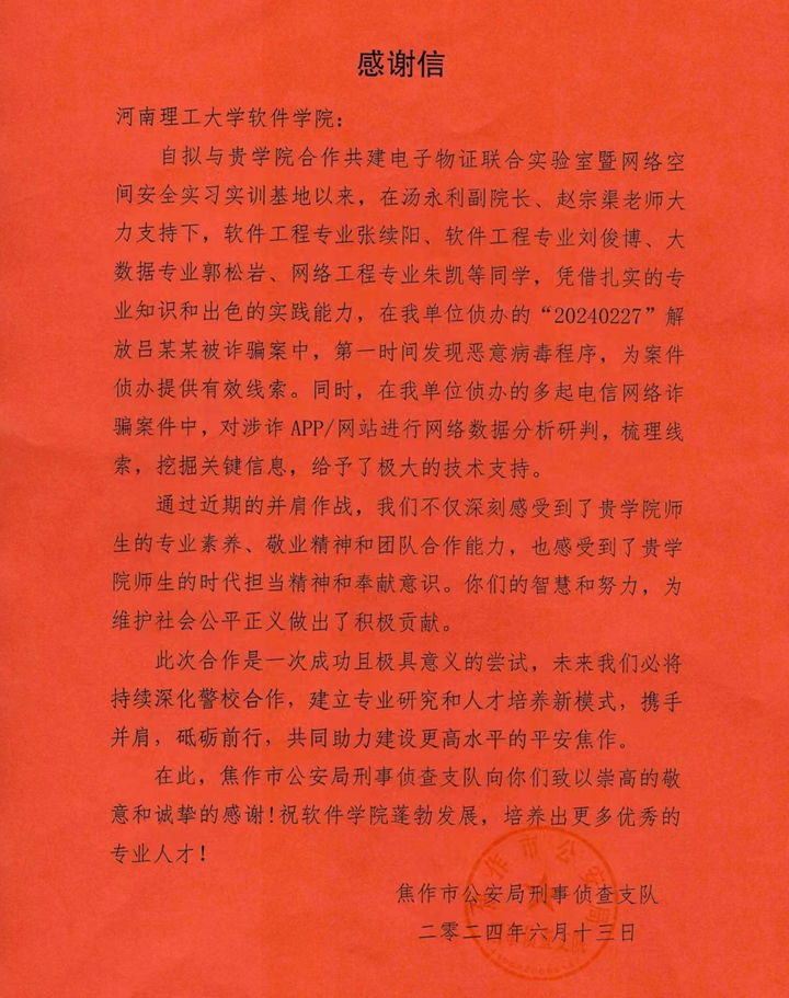 信中特别提到,自与软件学院共建实习实训基地以来,在学院老师的大力支持下,该院软件工程专业张续阳、刘俊博,大数据专业郭松岩,网络工程专业朱凯等同学,凭借扎实的专业知识,在“20240227”解放吕某某被诈骗案中,第一时间发现恶意病毒程序,提供了有效的侦破线索。同时,也在多起诈骗案件中对涉诈APP/网站进行了深入的网络数据分析研判,为案件侦破提供了有力的技术支持。