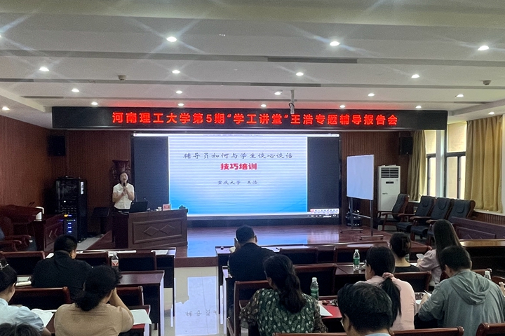 本网讯 (通讯员 赵琨 王文萍)6月18日上午,学校在物电学院226会议室举办第5期“学工讲堂”专题辅导报告会。本次“学工讲堂”邀请到了中国心理学会注册心理师、重庆大学原心理健康教育中心主任王浩为学校辅导员作《辅导员如何与学生谈心谈话技巧培训》的专题辅导报告。学工部和各学院(书院)党委副书记、辅导员共计120余人聆听了报告。报告会由学生工作部部长陈昊主持。