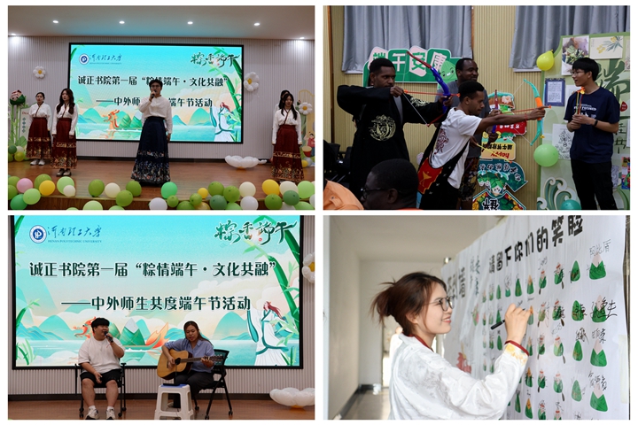 讲话完毕,精彩的节目陆续登场,中外师生准备了精彩的独具本国特色的节目,舞蹈、歌曲、朗诵……充分展示了多元文化交融的魅力。中外学生共同体验包粽子的乐趣后,又体验了长筷夹粽、趣味投壶、击鼓传粽等传统活动的乐趣,参与的师生个个喜笑颜开,相互鼓励,满怀希望、祝福和感恩,现场充满了欢声笑语和温馨的氛围。