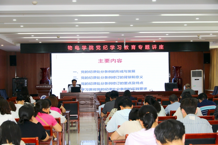 为扎实开展党纪学习教育,全面学习贯彻《中国共产党纪律处分条例》(以下简称《条例》),5月14日下午,物电学院邀请校宣讲团专家李照修作专题讲座,该院全体教职工和部分学生代表聆听讲座。