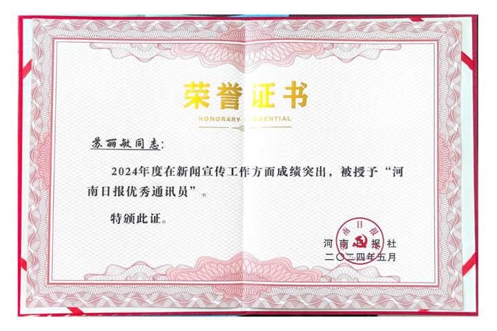 党委宣传部苏丽敏荣获“河南日报优秀通讯员”