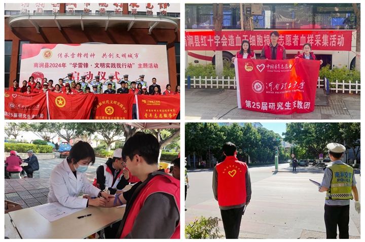校团委着眼发挥志愿服务活动的实践育人功能,发布了《关于开展“志愿新征程 建功新时代”学雷锋主题活动的通知》,引领广大青年学生在志愿服务中践行雷锋精神,在全校青年学生中开展了一系列志愿服务活动。在科普知识宣讲志愿服务活动中,志愿者们在焦作市东方红广场青年志愿亭通过知识问答、发放资料、讲解实际案例等方式向居民们进行了雷锋精神知识宣讲和防电信诈骗知识科普,增加了居民对雷锋精神了解,提高了当地居民的防诈骗意识,为构建和谐美好社会贡献力量;在敬老爱老志愿服务活动中,志愿者们在敬老院与老人一起聊天,一起歌舞,用志愿热情感染着身边的人,用爱心温暖着可爱的老人,弘扬了中华民族尊老、敬老、爱老、助老传统美德;在南涧县2024年“学雷锋·文明实践我行动”主题系列活动期间,我校第25届研究生支教团南涧分团志愿者在云南南涧彝族自治县配合活动人员做好场地布置的同时,与南涧彝族自治县公安局交警大队民警在城区各大交通路口开展文明交通志愿服务,并进行了“爱心献血”志愿活动,用实际行动服务社会,弘扬志愿服务精神。各项活动中,志愿者的服务得到了群众的充分肯定,展现了我校青年学生乐于助人、甘于奉献和充满理想的青春风采。