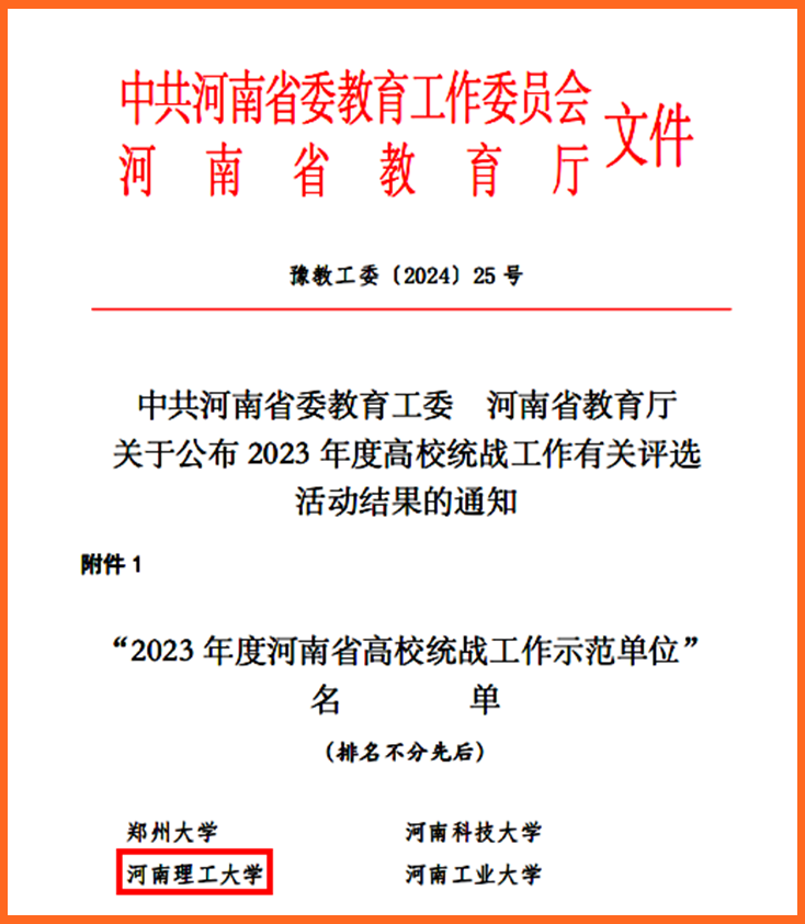 本网讯(通讯员 董明磊)近日,中共河南省委教育工委、河南省教育厅下发《关于公布2023年度高校统战工作有关评选活动结果的通知》,我校被授予“2023年度河南省高校统战工作示范单位”称号,这是我校连续三年获此殊荣。同时,安全科学与工程学院党委荣获“2023年度河南省高校基层党组织统战工作示范单位”称号,音乐学院党委书记贾宝先获评“2023年度河南省高校统战工作先进个人”。