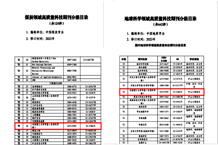 本网讯(通讯员 杨延麟)近日,中国科学技术协会网站公布了《高质量科技期刊分级目录总汇(第三版)》。《河南理工大学学报(自然科学版)》入选“煤炭领域高质量科技期刊分级目录T2级”和“地球科学领域高质量科技期刊分级目录T2级”。这是该刊继2020年入选《高质量科技期刊分级目录总汇》后,再次获此殊荣。