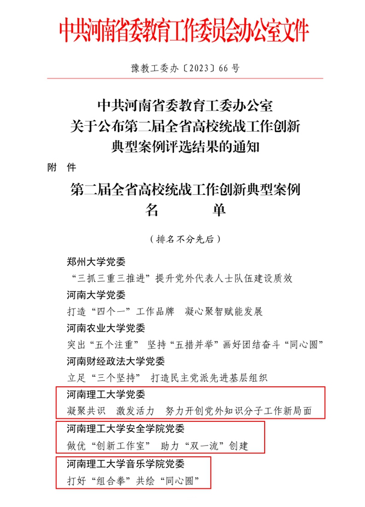 学校党委申报的《凝聚共识激发活力努力开创党外知识分子工作新局面》获评“2023年度河南省高校党委统战工作创新典型案例”,安全学院党委申报的《做优“创新工作室”,助力“双一流”创建》、音乐学院党委申报的《打好“组合拳”共绘“同心圆”》获评“2023年度河南省高校院(系)党组织统战工作创新典型案例”。