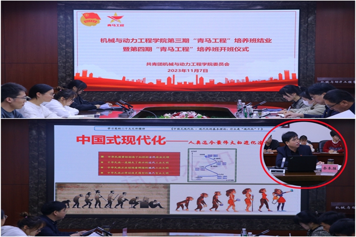 仪式在国歌中拉开序幕,余本胜为学院第三期“青马工程”培养班优秀学员颁发了结业证书,老学员向新学员授班旗,第三期“青马工程”培养班优秀学员代表和第四期“青马工程”培养班学员代表分别进行发言。余本胜代表学院党委对“青马工程”培养班学员在坚定理想信念、厚植爱国情怀、锤炼奋斗精神三个方面提出了殷切期望,并勉励大家在学习马克思主义的道路上,坚定信念,脚踏实地,始终牢记团员青年的政治使命,用党的科学理论武装头脑,紧跟党的步伐,成长为新时代最坚定的青年马克思主义者。仪式在团歌中落下帷幕。余本胜围绕《青年发展与中国式现代化》为第四期“青马工程”培养班学员作专题报告。