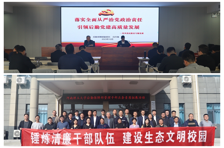 27日上午,后勤保障部党总支在焦作市委组织部党员教育培训基地开展党风党纪教育月专题培训。会上,党总支书记王立东就做好校内巡察工作,从“提高政治站位、聚焦问题导向、强化整改落实”等三个方面进行了强调和部署。随后,王立东结合学校党风党纪教育月活动主题,以《党员干部如何提高自身“免疫力”》为题,就持续做好后勤党风廉政建设进行专题党课教学。他要求:一是常学从政之范;二是常怀律己之心;三是常记为民之责;四是常思贪欲之害;五是常悟人生之理。会议期间,后勤部副部长白万备以《落实全面从严治党政治责任,引领后勤党建高质量发展》为题,从“巡视巡察的概念、巡视巡察的发展历史、开展校内巡察的重要意义、校内巡察的主要内容”等方面,深入解读了校内巡察的重要意义及工作要求等。