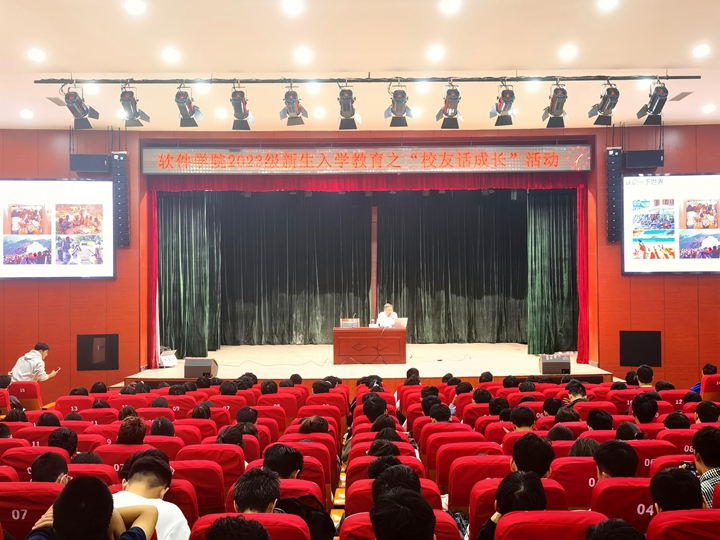 本网讯(通讯员 刘军)为发挥优秀校友榜样引领作用,激励学生奋发学习,10月21日下午,软件学院在北校区小礼堂开展2023级新生入学教育之“校友话成长”系列活动。我校2001级校友官琪受邀主讲,软件学院学生共计400余人共同参加活动。