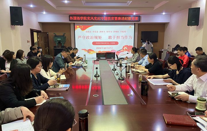 为贯彻落实校党委关于党风廉政建设的有关要求,深入开展党风党纪教育月活动,10月17日下午,外国语学院党委在文综楼311会议室组织全体教职工开展了党风党纪专题会暨廉洁教育党课。会议由党委书记许荣梅同志主持。