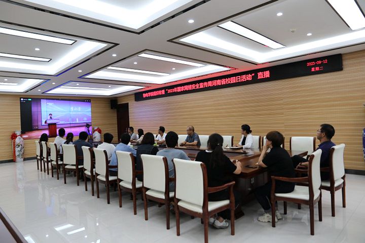 本网讯 (通讯员 杨意宁 杨芷悦)为坚持以习近平新时代中国特色社会主义思想为指导,全面贯彻落实党的二十大精神,深入宣传习近平总书记对科技创新和科学普及的战略擘画。9月12日上午,物电学院组织部分师生在综合实验楼226会议室集中收看“2023年国家网络安全宣传周河南省校园日活动”直播。