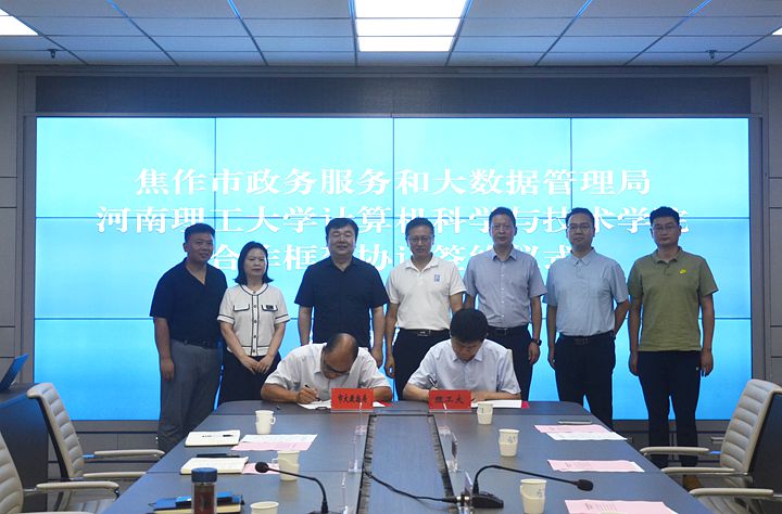 本网讯 (通讯员 贺军义 冯文峰)为深入推进校地融合,提高我校计算机类专业人才培养质量,7月26日上午,计算机学院与焦作市政务服务和大数据管理局合作框架协议签约仪式在市政务服务和大数据管理局三楼会议室举行。计算机学院相关负责人,市政务服务和大数据管理局党组书记、局长康春生,副局长郭丽敏,党组成员、副局长麻尚祥,副局长贺军义及部分科室负责人参加仪式。