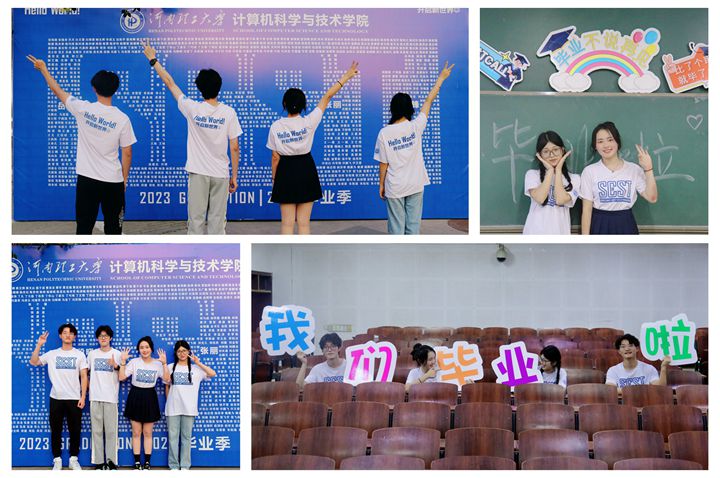 毕业纪念衫设计经过多次毕业生需求调研,设计独具匠心,正面以学院英文简称SCST(SchoolofComputerScienceandTechnology)为主要标识元素,细节处体现学校英文简称(HPU)、学院办学时间(1983)、2023毕业季(2023Graduation)以及编程语言C#(C Sharp)等元素。主图案采用镂空设计,体现国际潮流风范,左臂印制学院院徽,背面以计算机程序设计标志性符号“Hello World!”为主要元素,辅以中文翻译“开启新世界”,含蓄表达计算机学院毕业生身份,寓意走出校园开启个人发展新世界。文化衫分为蓝色和棕红色两款,分别赠与780余名本科毕业生和100余名研究生毕业生,祝福毕业生继续秉承着母校的校风校训,满载学识与风采,走向光明美好未来,在中国式现代化建设的广阔舞台中贡献自己的青春力量。