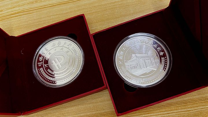 今年,学校为2023届每名毕业生定制了一枚毕业纪念章和一件毕业纪念衫。毕业纪念章正面刻有学校西门立体浮雕图案和“河南理工大学2023届毕业纪念”等字样,纪念章背面除设计有学校校徽外,还刻有“明德任责”校训及“好学力行”校风等内容。纪念章外带亚克力保护壳,并采用红色礼盒独立包装,制作精美大方。毕业纪念衫采用精梳棉材质,透气吸汗不缩水,纪念衫左袖印有学校校徽图案和“2023”字样,胸前设计有“青春”字样,整体设计美观大方,彰显青春活力。