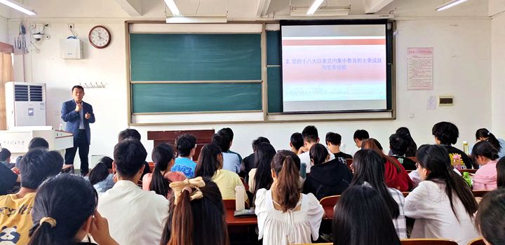 在党课中,刘春德以《以习近平新时代中国特色社会主义思想培根铸魂——结合学习贯彻习近平新时代中国特色社会主义思想主题教育谈体会》为题,从党的十八大以来历次党内集中教育的主要成就与宝贵经验,世情、国情、党情、民情开展主题教育的时代背景,从新时代新征程党和国家事业发展全局的战略高度深刻认识开展主题教育的重大意义等五个方面展开讲解。他指出,开展党内集中教育是我们党加强自身建设、推进自我革命的一大法宝。要深刻认识此次主题教育为加强党的创新理论武装、不断提高全党马克思主义水平提供了重要契机,深刻认识此次主题教育是贯彻落实党的二十大精神的重大举措,深刻认识此次主题教育是推动党的自我革命,不断提高党的执政能力和领导水平的重要途径。要善于运用习近平新时代中国特色社会主义思想观察时代、把握时代、引领时代,防范化解重大风险,分析解决推进发展中的各种矛盾和问题,深入推进全面从严治党,以中国式现代化全面实现中华民族伟大复兴。他勉励广大同学要牢记习近平总书记的殷殷嘱托,坚定不移听党话、跟党走,怀抱梦想又脚踏实地,敢想敢为又善作善成,用科学理论武装头脑,自觉与党中央保持一致,践行党的民主集中制,弘扬良好学风和校风,时时处处事事争先,立志做有理想、敢担当、能吃苦、肯奋斗的新时代好青年,让青春在全面建设社会主义现代化国家的火热实践中绽放绚丽之花。