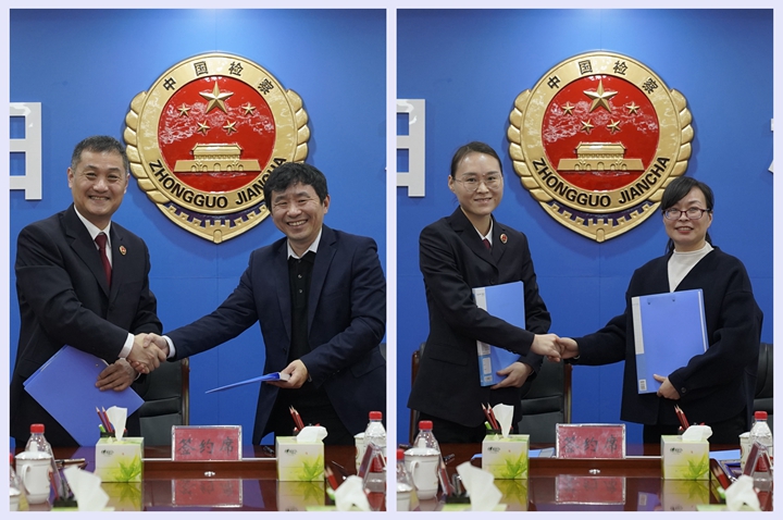 在与会人员见证下,该院副院长曹爽、谢珺与检察院政治部主任徐慧文、副检察长张伟分别代表双方在合作协议上签字。