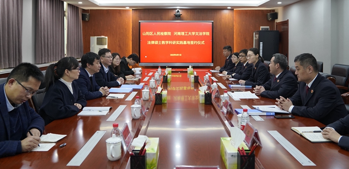 本网讯 (通讯员 何平)3月1日上午,文法学院与焦作市山阳区人民检察院合作共建就业实习基地、法律硕士教学科研实践基地签约仪式在山阳区人民检察院会议室举行。山阳区人民检察院检察长张海军、副检察长张伟,文法学院部分处级干部、法学系相关负责人及教师代表参加了仪式,仪式由张海军主持。