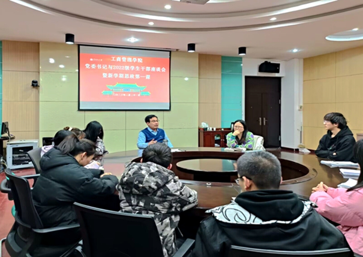 本网讯(通讯员 陈莎莎 徐蕾)为深入贯彻习近平新时代中国特色社会主义思想和党的二十大精神,全面落实《关于新时代加强和改进思想政治工作的意见》,利用学生返校开学契机更好地激励学生自信自强、踔厉奋发和勇毅前行,工商管理学院于2月21日在1106会议室开展了新学期思政第一课,该院党委书记许传阳作思政第一课主题宣讲,并与同学们进行座谈,该院2022级工业工程、旅游管理专业40名学生参加。