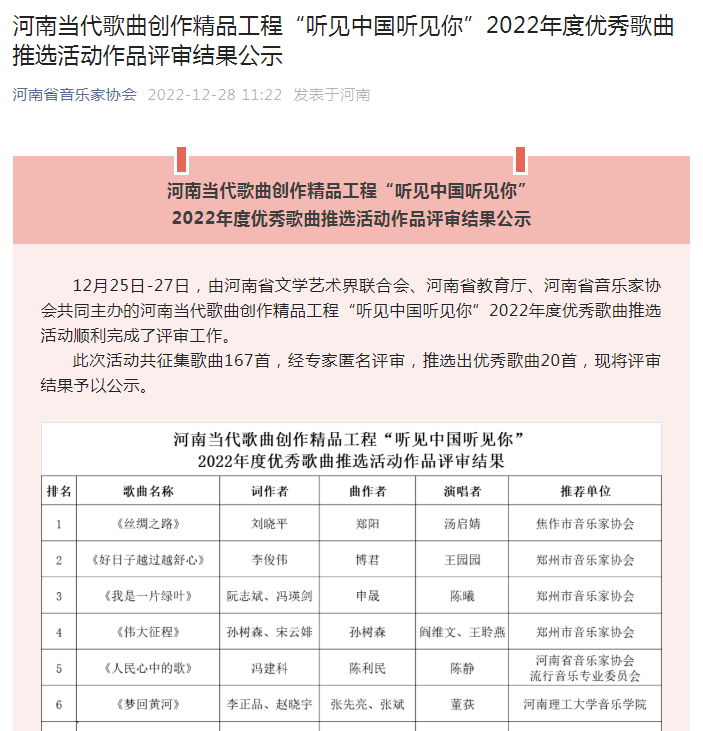 本网讯(通讯员 张先亮) 12月25日-27日,由河南省文学艺术界联合会、河南省教育厅、河南省音乐家协会共同主办的河南当代歌曲创作精品工程“听见中国听见你”2022年度优秀歌曲推选活动顺利完成了评审工作,我校音乐学院报送的歌曲《梦回黄河》成功入选。