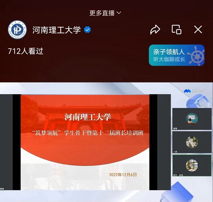 本网讯 (通讯员 邢桦)为进一步加强学生基层班级建设,提高基层班级工作的规范化、制度化和科学化水平,12月6日下午,我校举办“筑梦领航”学生骨干暨第十二届班长线上专题培训班,2-5年级本、专科学生骨干、2022级新生班长等800余人参加此次专题培训会。