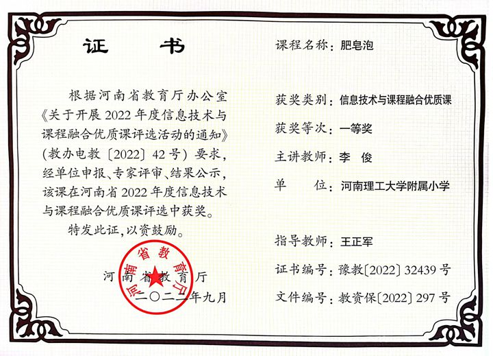 本网讯 (通讯员 刘冬卉 张秋玲)硕果芬芳佳绩传,橙黄橘绿酬清秋。近日,资产公司理工教育中心小学教师专业化成长再传喜讯,在2022年度河南省信息技术与课程融合优质课评选活动中,李俊老师主讲的课程《肥皂泡》喜获一等奖,这也是本年度示范区唯一一个省级一等奖;周冬冬老师主讲的课程《飞向蓝天的恐龙》荣获二等奖。