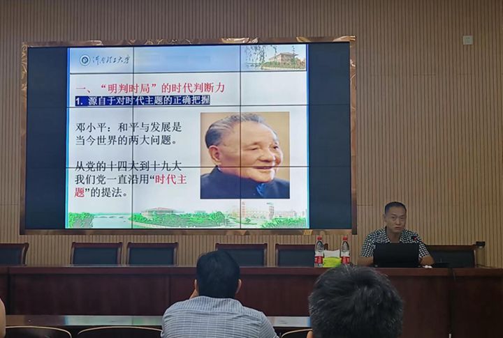本网讯 (通讯员 雒芬)为深入学习习近平新时代中国特色社会主义思想,迎接党的二十大胜利召开,9月27日,软件学院党委理论学习中心组(扩大)在北校区学术报告厅开展集中学习,邀请马克思主义学院副教授曹根记作专题辅导报告。院党委理论学习中心组成员、全体党员教师参加报告会。报告会由该院党委书记王伟超主持。