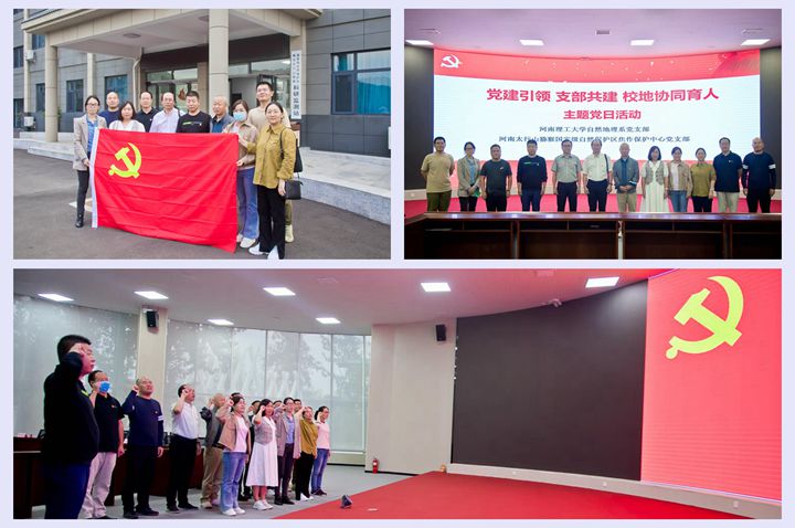 在焦作市森林公园,林业大数据中心详细听取了焦作林业现代高新实时监测设备、监测范围以及监测物种;观看了焦作市林业生态建设专题片,认识了河南太行山猕猴国家级自然保护区概况以及焦作保护中心在森林、湿地等重点生态保护区中做出的贡献。会上,双方就实践教育基地合作共建、人才联合培养、项目建设等进行深入交流,签署合作协议,共同构建起校地联合育人框架。随后一行人赴自然保护区科研监测站开展现场勘查,举行实践基地挂牌仪式,为双方今后合作奠定良好的发展基础。最后,参加活动的党员们重温入党誓词,重忆入党初心,再一次接受了思想洗礼。