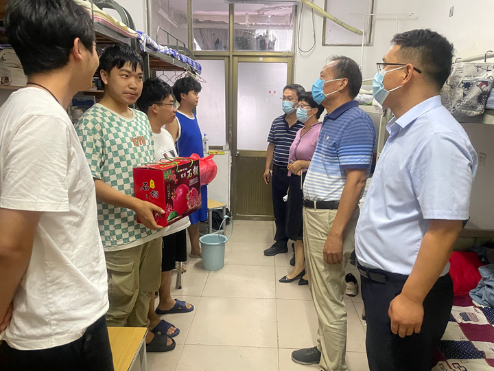 该院院长贾宗璞代表学院向同学们表达了节日的慰问和亲切的关怀,并为同学们送上该院精心准备的石榴和防疫物资。接着,他询问了同学们的学习、生活情况,号召同学们做好防护、认真落实疫情防控要求“非必要不离焦、非必要不出校”。同时,他勉励同学们珍惜大学时光,学好专业技能,健康快乐成长,努力成为对社会、对国家有用的人。