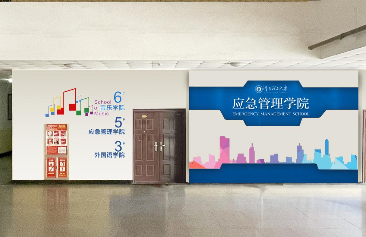 此外,学校还在文科楼一楼大厅为马克思主义院、外国语学院、应急管理学院设计了院名墙,分别融入了三个学院各自的文化、学科、专业内涵,风格各异,各具特色。在文科楼的大门口门头,设计安装的学院名牌、重点实验室、研究中心等名牌,银灰底色,蓝字,整体效果和谐统一,端庄大气。