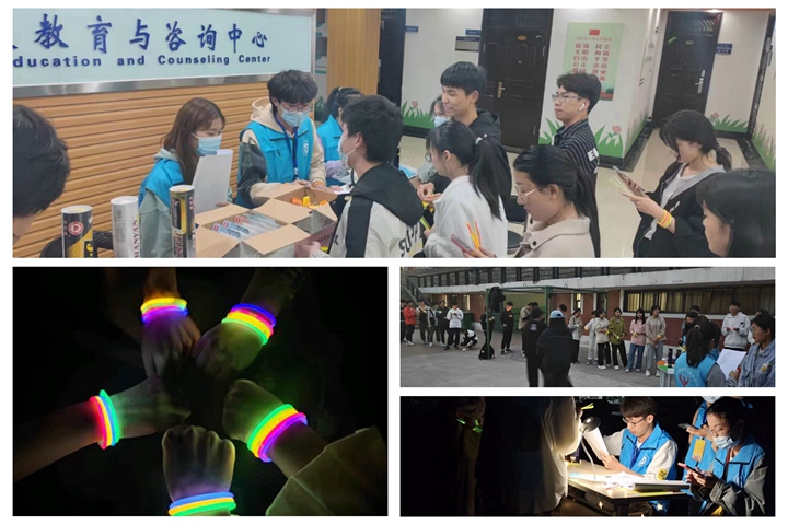 此次“荧光夜跑”乐享健康生活活动是我校历时一个月的第六届大学生心理健康文化节的重要活动之一。活动前期,大学生心理健康协会在心理中心教师的指导下,认真制定方案,精心设计打卡点、心理健康知识题目等。活动现场,伴着日落,参与学生错峰、有序从西区体育场出发,沿着馨月湖进行夜跑打卡。期间,共设置学苑餐厅门口、馨月湖中桥、馨月湖西桥、心理健康教育与咨询中心4个打卡点,终点设置在心理中心大厅预约接待台。为了增加活动的专业性和趣味性,每个打卡点设置了心理健康知识问答环节,参与学生手戴荧光手环,与同学、室友相约跑步打卡,积极回答心理健康知识问题,纷纷合影留念,共同度过了一个充实且难忘的夜晚,一起体验着健康奔跑的乐趣。