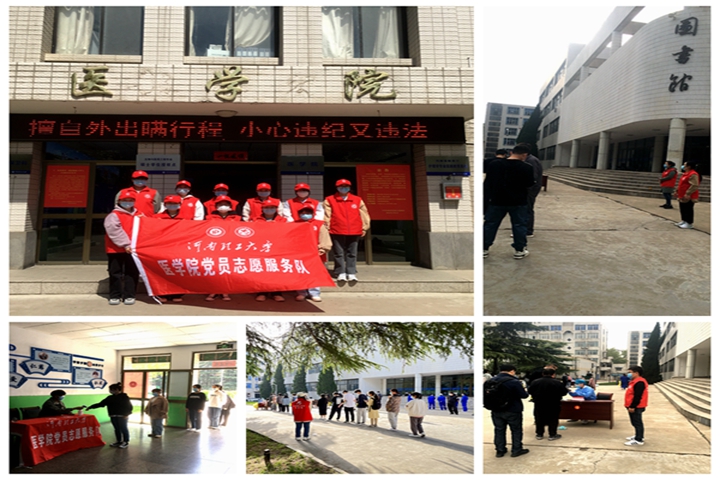 在做好医学院疫情防控工作的同时,党员志愿者们积极参与学校的疫情防控工作,主动投身到第一线、战斗在最前沿。在北校区帮助检测人员做前期准备、组织检测人员有序排队、测前消杀等工作,用实际行动诠释了“我是党员我带头,疫情防控我先行”的责任担当。