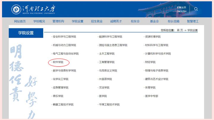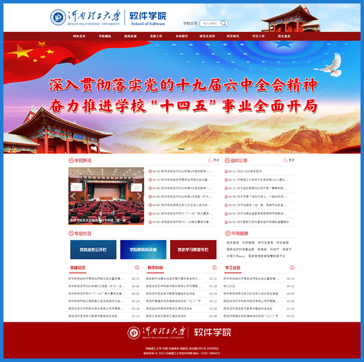 软件学院官方网站以学校鸟瞰图为主背景,红和白为主色,界面美观简洁。网站结合学院办学优势和专业特色,开辟了学院概况、机构设置、党群工作、本科教学、研究生培养等栏目,并设置党史学习教育、学院教师风采展等专题栏目,重点宣传学院在坚持立德树人、提升人才培养质量、加强特色办学建设等方面的具体成效。软件学院官方网站网址:http://ss.hpu.edu.cn/,网站部分栏目仍在建设完善中,欢迎浏览并提出宝贵意见建议。