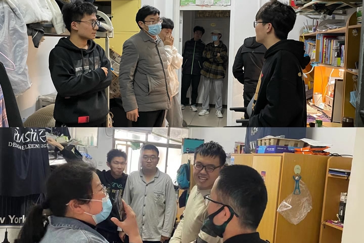 走访过程中,该院教师详细了解了同学们的日常生活状况、心理状态、学习情况,仔细询问了学生在封闭管理期间的生活和心理诉求,耐心解答了学生关切的一些问题,并就自己的生活经历进行了真诚分享,鼓励学生们要积极培养理性阳光的心态和坚韧不拔的耐力,把困难当磨砺,与祖国共成长。各位辅导员老师仔细查看查看了宿舍的卫生安全情况。提醒学生要时刻保持宿舍卫生、严禁违规用电、遵守宿舍公约、养成文明习惯,最后强调学生们要配合疫情防控工作,坚持每日健康检测,按规定做核酸检测,并及时进行数据上报。