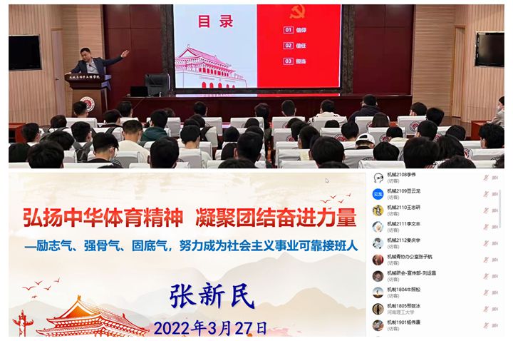 张新民通过腾讯会议以“弘扬中华体育精神 凝聚团结奋进力量,励志气、强骨气、固底气,努力成为社会主义事业可靠接班人”为主题,首先与学生一起学习中华体育精神的深刻内涵和重要意义,倡导学生要从“为国争光,无私奉献,科学求实,遵纪守法,团结协作,顽强拼搏”的中华体育精神中汲取奋斗力量,牢记并践行党的初心使命,增强民族文化自信,增强“为中华之崛起而读书”的志气,增强“勇攀世界科研高峰”的骨气,增强“天将降大任于斯人也”世界责任担当的底气。接着,结合新时代中国高等教育快速发展形势与国际、国内工科发展的新趋势、新挑战、新机遇,张新民勉励学生要在时间、学习、精神、习惯四个层面上加强自我管理,密切关注与机械行业有关的新兴学科和人文学科,储备多方面知识,顺应国家发展需求,使自己成长为德智体美劳全面发展的新工科人才,其中,尤其要重视“体”的发展。这一人才成长目标要求学生积极弘扬体育精神,注重体育锻炼,增强体魄,增强毅力,提升自身精神风貌,主动从宿舍走进操场,走进教室,走进图书馆,走进科创中心,勇攀知识高峰,将自身成长与国家命运相融合,把握成长机遇,迎接挑战,以昂扬奋斗的精神风貌迎接世界未有之大变局。