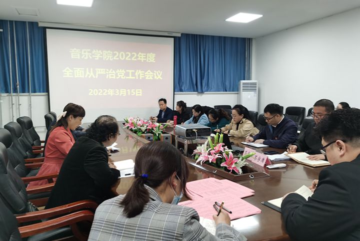 本网讯(通讯员 赵伟利)3月15日下午,音乐学院在该院办公楼101会议室召开2022年度全面从严治党工作会议。该院领导班子成员,各科室负责人,各系部负责人,各支部书记参加会议。会议由该院党委副书记王建军主持。