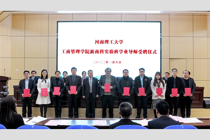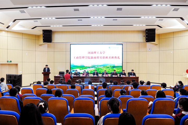 本网讯(通讯员 黄天乐 徐蕾/文 记者 李为群/图)3月8日下午,工商管理学院在经管楼新落成的尚为MBA学术报告厅举行2020级和2021级工商管理新商科实验班开班典礼,副校长沈记全,校领导郑广华,教育部工商管理类教指委秘书长葛京,郑州新东方国际教育总经理陈玲,焦作市文联副主席王利江出席会议,教务处、学生处、国际处以及该院负责人、教师代表、校企合作企业代表及2020级和2021级工商管理新商科实验班全体学生参加会议。会议由该院院长孟钟剑主持。