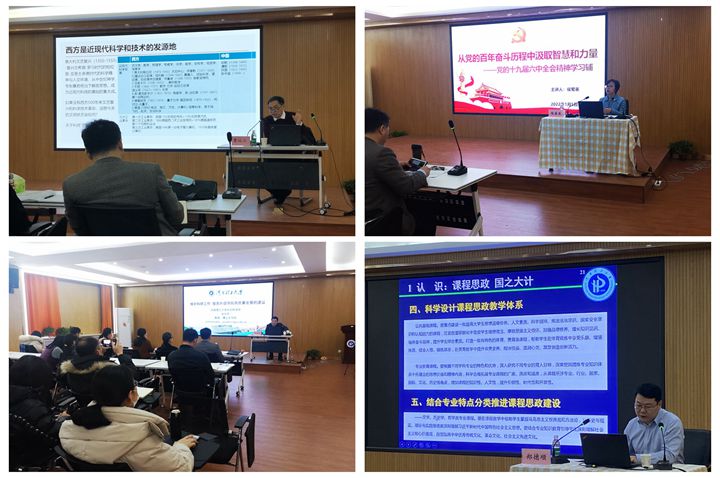 1月6日上午,组织教师观看了哈尔滨工业大学教授、博士生导师站德臣教授所作的《国家级一流课程申报政策要求与评价标准分析》视频报告,从中学习了一流课程申报的相关政策、申报书和申报材料的撰写、准备方法及评价标准等。下午,我校马克思主义学院院长郑小九作了题为《领会新决议,奋进新征程——学习贯彻党的十九届六中全会精神》的报告,他从总结党的百年奋斗重大成就和历史经验的重大意义、习近平新时代中国特色社会主义思想的理论体系和指导地位、恪守全心全意为人民服务的根本宗旨、党的百年奋斗的重大成就和历史意义、奏响奋进新征程的壮丽乐章等五个方面,深入浅出地解读十九届六中全会精神和《中共中央关于党的百年奋斗重大成就和历史经验的决议》。