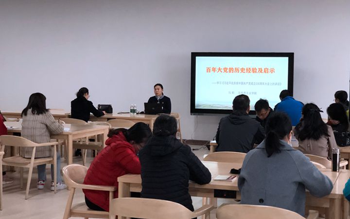 为深入推进党史学习教育,10月19日上午,图书馆邀请学校党史学习教育宣讲团专家、马克思主义学院副教授马莉为全体职工作了题为《百年大党的历史经验及启示——学习<习近平在庆祝中国共产党成立100周年大会上的讲话>》的党史宣讲课。