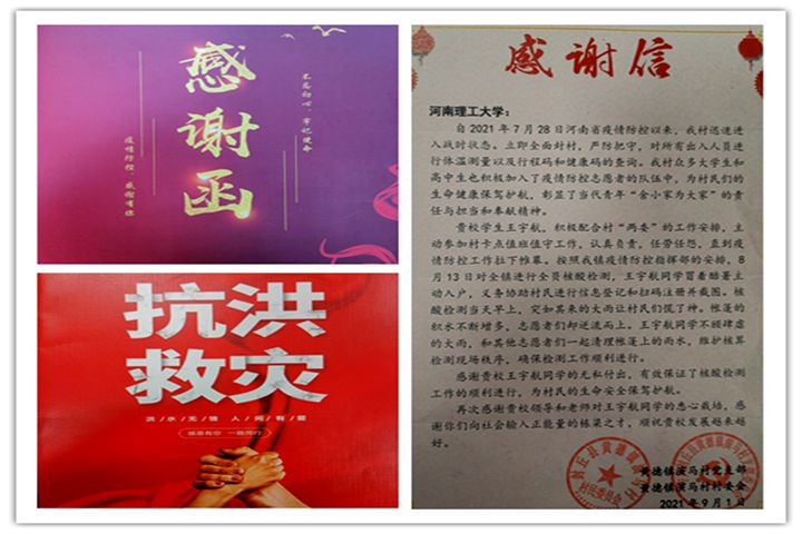 2021年暑假期间,新冠肺炎疫情先后在国内多个城市出现反弹,突发的暴雨也引发了大面积的洪灾,面对肆虐的疫情与洪水,该院第一时间向广大同学发出了“做好自身安全防范,积极投身家乡防汛抗疫志愿服务”的号召,同学们闻令而动,逆向而行,冲锋一线,担当作为,用实际行动向社会传递了温暖与力量,构筑了守护人民健康和家园安全的坚固城墙,也践行了“请党放心,强国有我”的铮铮誓言,一封封《感谢信》与《表扬信》就是最好的见证。