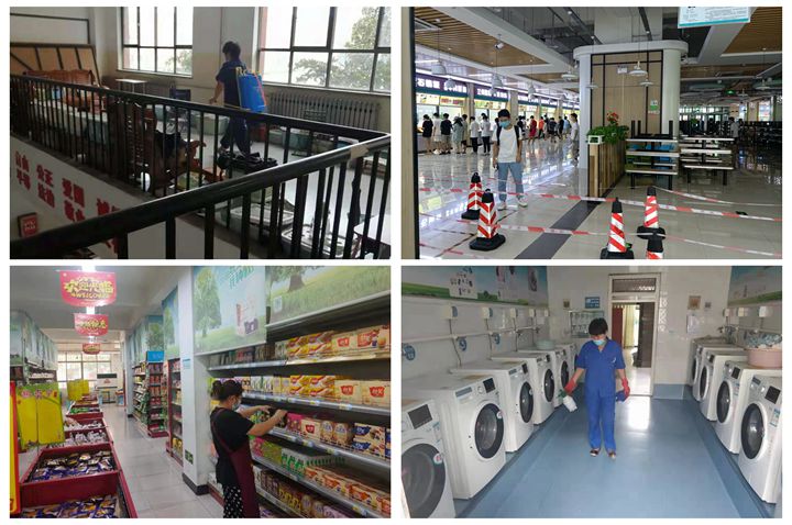 一是从加强后勤职工管理抓起,严格按照相关要求,对全体职工进行中高风险及关联地区行程追溯,组织对全体职工的行程码和健康码进行查验,并要求在校工作期间全程佩戴口罩,确保后勤服务稳定。二是强化食堂管理和商品供应,对食堂进行分流管控,要求师生进入食堂必须佩戴口罩,并取消堂食,全部进行餐盒打包,避免人员聚集;加强商品价格管理和物资储备,保障果蔬、鸡蛋、粮油、方便食品、日化用品等充足平价供应。三是持续做好校园环境和公共区域管理,利用洒水车等设备对学校主要区域进行消毒;每天对教学楼、宿舍楼、班车等公共区域进行通风和消杀,并免费配备消毒液供学生使用。同时,对进入公共区域的师生进行测温,确保校园安全稳定。四是严格住宅区出入管理,对出入住宅区的人员及车辆全部查验行程码和健康码,并测量体温,做好来往人员管控,严防病毒输入性传播。同时,按照属地管理原则,积极配合社区做好入户信息摸排及居家隔离等工作。五是做好疫情防控和灾后重建工作统筹,在认真落实疫情防控各项工作措施的同时,统筹推进灾后校园后勤服务设施修复重建工作,确保两不误两促进。