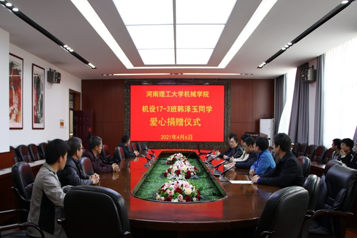 本网讯(通讯员 胡相忠)眷眷母校情,拳拳学子心。4月6日下午,机械学院2021届毕业生韩泽玉同学爱心捐赠仪式在该院217会议室举行。机械学院党委书记聂凯、实验中心负责人、机设与车辆系部分教师和学生代表一同参加了仪式。仪式由该院车辆系党支部负责人主持。