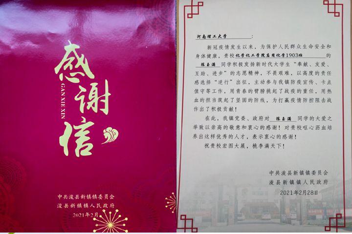 本网讯(通讯员 张迎雪)近日,化工学院收到中共浚县新镇镇委员会、浚县新镇镇人民政府的感谢信,来信肯定该院学生陈玉满在家乡抗疫中的突出表现。同时,寿宁新闻网也报道了该院刘一弘积极参加抗疫的先进事迹。2021年寒假期间,为保护人民群众生命安全和身体健康,该院多名志愿者发扬新时代大学生“奉献、友爱、进步、进步”的志愿精神,积极参加当地的防疫宣传、卡点值守工作,其先进事迹得到多方肯定,并被多家媒体报道。