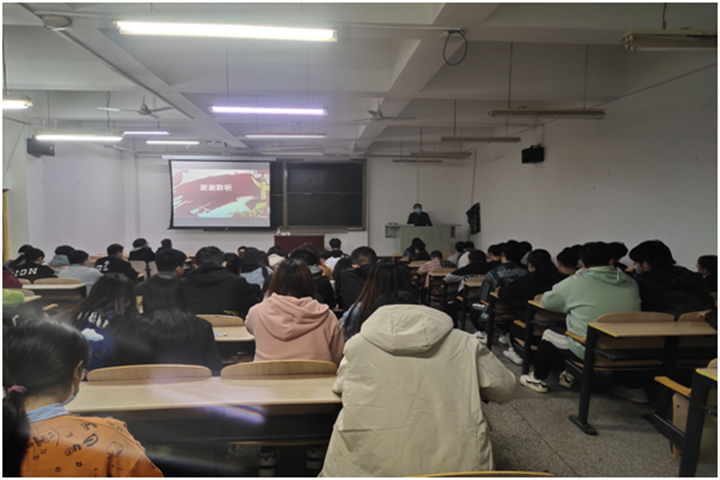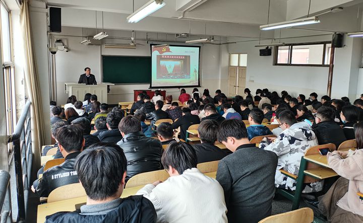 王书卿以“四个围绕”为主题,结合《2021年国务院政府工作报告》及十三届全国人大四次会议精神分别从“新时代对大学生提出新要求”、“新时代大学生要有新作为”两个方面进行阐释。他首先带领大家学习了习近平总书记在党史学习教育动员大会上的讲话精神及学校党史学习教育动员会精神。指出在全党开展党史学习教育,是党中央立足党的百年历史新起点、统筹中华民族伟大复兴战略全局和世界百年未有之大变局、为动员全党全国满怀信心投身全面建设社会主义现代化国家而作出的重大决策。在庆祝我们党百年华诞的重大时刻,在“两个一百年”奋斗目标历史交汇的关键节点,在全党集中开展党史学习教育,正当其时,十分必要。在全党开展党史学习教育,是牢记初心使命、推进中华民族伟大复兴历史伟业的必然要求,是坚定信仰信念、在新时代坚持和发展中国特色社会主义的必然要求,是推进党的自我革命、永葆党的生机活力的必然要求。随后,王书卿对《2021年国务院政府工作报告》进行讲解并提出新时代要求大学生要树立正确人生观、价值观和世界观;要学好专业技能,以适应社会主义现代化建设的需要;要培养高尚的道德情操,学会做人。新时代大学生要有新作为,要坚定理想信念,点燃人生动力;要树立良好形象,提升精神面貌;要加强理论学习,打好奋斗基础。