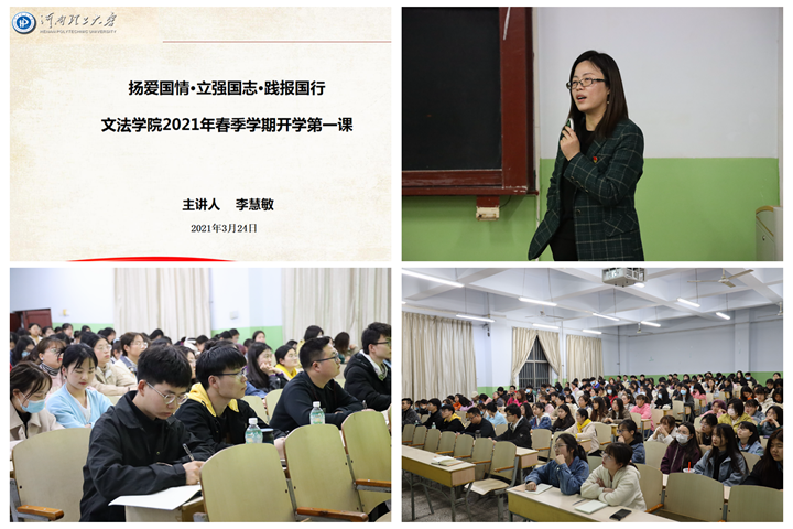 为贯彻落实《河南理工大学春季学期“开学第一课”工作方案》,引导大学生树立正确的世界观、价值观和人生观,增强责任感和使命感,以最饱满的热情投入到新学期的学习生活中去,3月24日晚,文法学院于北校区2101教室组织开展春季学期“开学第一课”活动,学院党委书记李慧敏走上讲台,聚焦“四个围绕”,为2019级中文和广告专业共200余名学生作题为“扬爱国情·立强国志·践报国行”的专题讲座。