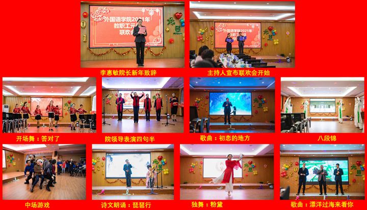 联欢会节目内容形式多样,丰富多彩。开场舞《答对了》将一片和谐融洽带入现场,让全体教职工沐浴到激情、温暖的气氛。一声声歌曲联唱,青春气息萦绕心间,游戏环节爆笑不断。诗词朗诵《新时代最可爱的人》让人回想2020年的艰辛和“新时代最可爱的人”,更充满对未来的希望。该院领导班子成员深情演绎语言荟萃《四句半》,展示了雷厉风行、顾全大局、亲和友善、积极地工作态度,调动了全体教职工的热情与活力,将联欢会推向高潮,最后在英语、日语系老师们合唱的《拍手歌》中,完满落下帷幕。